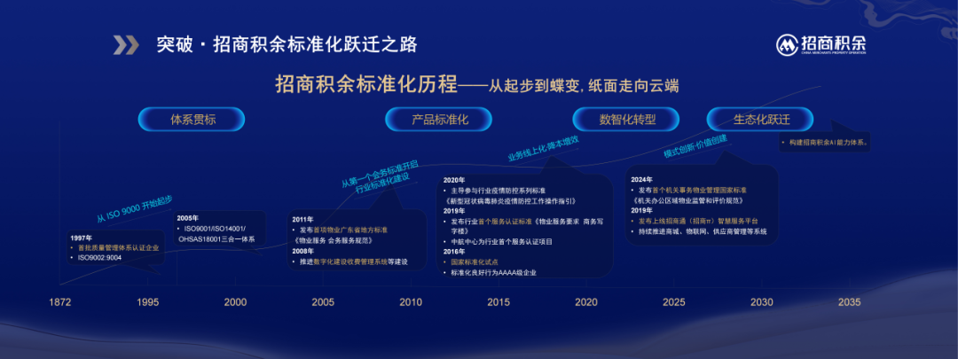 招商积余自1997年引入ISO9000贯标,逐步构建起涵盖产品、服务、管理三大维度的标准化体系。近年来,招商积余通过数字化平台建设、人工智能应用探索,实现了从“工业时代精进者”向“数智时代进阶者”的跨越式发展。