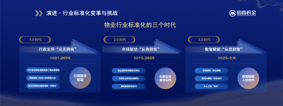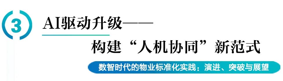 当前,中国物业行业标准化已然进入“2.0标准化时代”向“3.0智能化时代”的关键过渡期。过去几十年中,行业标准化经历了从行政主导到市场驱动,再到如今数智赋能的演进过程。随着AI、大数据等前沿技术的广泛应用,物业标准化将基于数据模型和人机协同标准,更精准地配场景与客户需求。