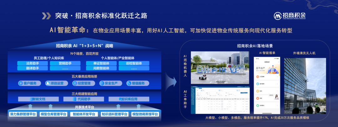 在数智化转型方面,招商积余构建“1+3+5+N”AI发展战略,围绕一个共享技术平台,推进三大统建智能应用、五大垂类场景及N个个性化场景的落地。