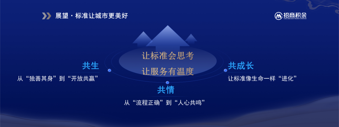 在标准化建设道路上,招商积余将致力于“让标准会思考,让服务有温度”,以“共生”破界,打破企业边界,推动标准成为连接硬件厂商、服务商、业主的生态语言;以“共情”暖心,在服务标准中融入人文关怀,让冰冷的制度更具温度;以“共成长”致远,借助数据与智能技术,让标准具备自我迭代、动态优化的能力。